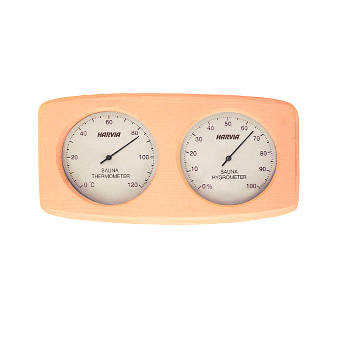 Термогигрометр Harvia имеет оригинальную прямоугольную форму вырезанную из массива сосны.