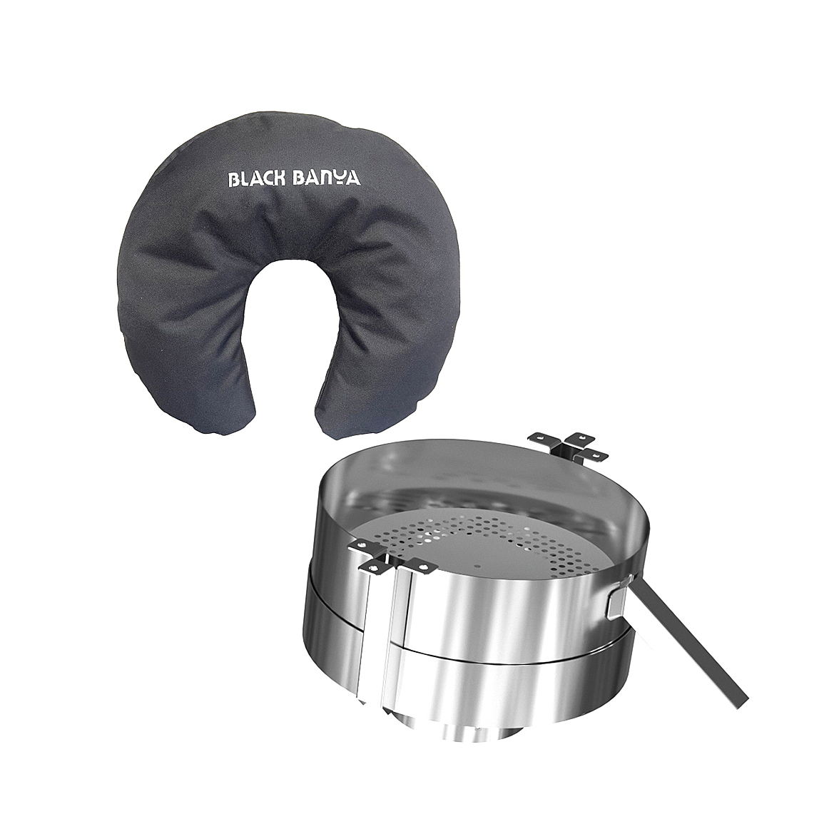 Устройство состоит из двух частей: — "съемная нержавеющая чаща" - "труба-воздуховод". Первая часть выполняет функцию фито-контейнера. В неё мы кладём травы, фито пакеты или масла, можно даже кусочки фруктов — в общем, все то, что даёт приятный, и самое главное — полезный аромат. Так же в эту чащу можно укладывать лёд — тогда воздух будет не только насыщенным и свежим, но и прохладным — даже в летнюю жару. После использования контейнер легко вынимается, чистится, моется — и он снова готово к работе. Кстати, наличие льда или снега в контейнере достаточно для охлаждения человека даже без дополнительного притока воздуха (например, если парная находится в подвале, и нет возможности забрать воздух с улицы). "Труба-воздуховод" предназначена для подачи свежего воздуха с улицы. Имеет кондесатосборник для слива влаги (рекомендуется надеть силиконовую трубку и вывести в канализацию). Также устройство имеет патрубок диаметрорм 100 мм. для подсоединения гоффротрубы, соединяющей устройство с улицей. Дополнительно, для увеличения потока воздуха, можно использовать маломощный вентилятор 12 V. Подушка Black Banya приобретается отдельно.