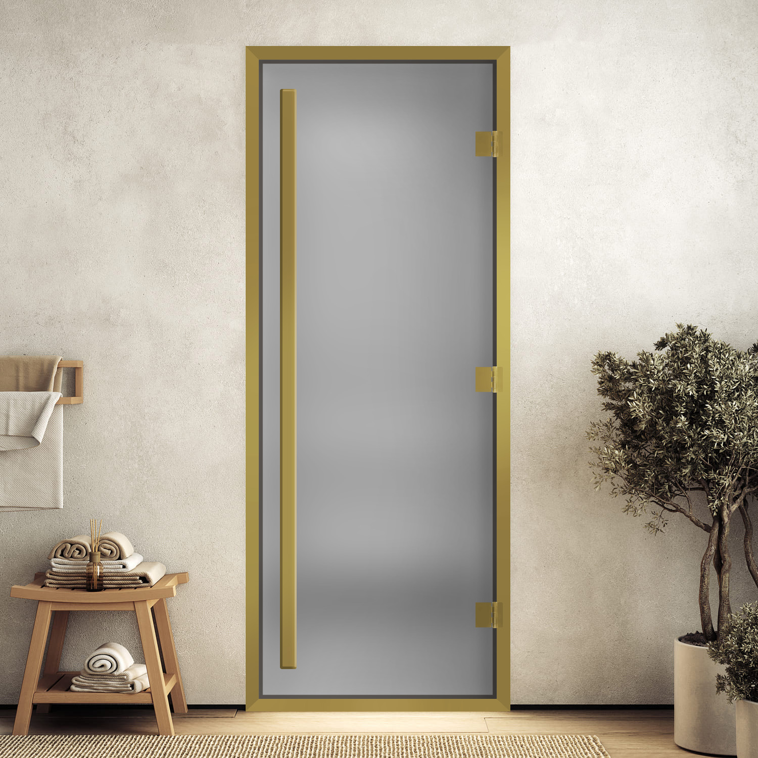 DoorWood Дверь «Хамам престиж сатин» в золотом профиле