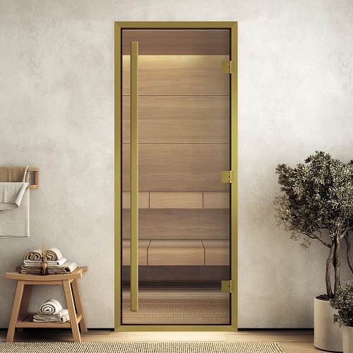 Арт. 0024803. Дверь "Хамам престиж прозрачное" в золотом профиле 2100*700.