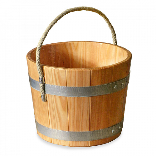 Бадья для сауны объемом 5 литров. Внутри и снаружи — бесцветное гигиеническое покрытие. Абсолютно водонепроницаема. Два обруча из оцинкованной стали.