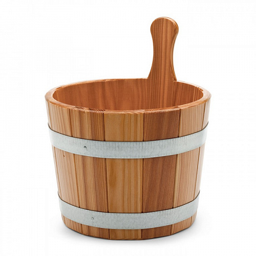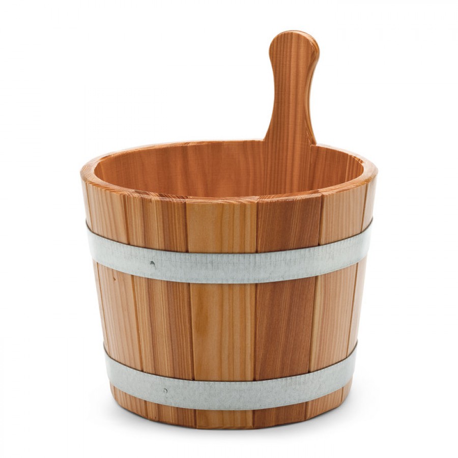 Бадья для сауны объемом 5 литров. Внутри и снаружи — бесцветное гигиеническое покрытие. Абсолютно водонепроницаема. Два обруча из оцинкованной стали.