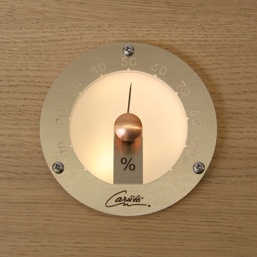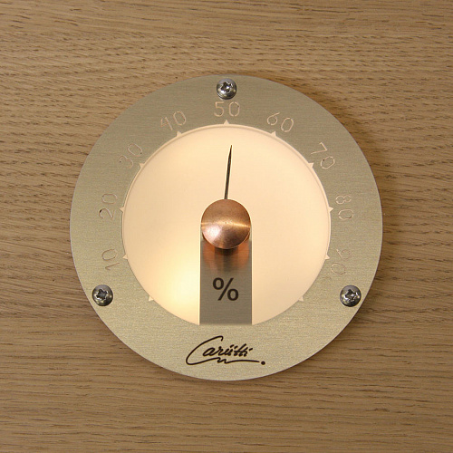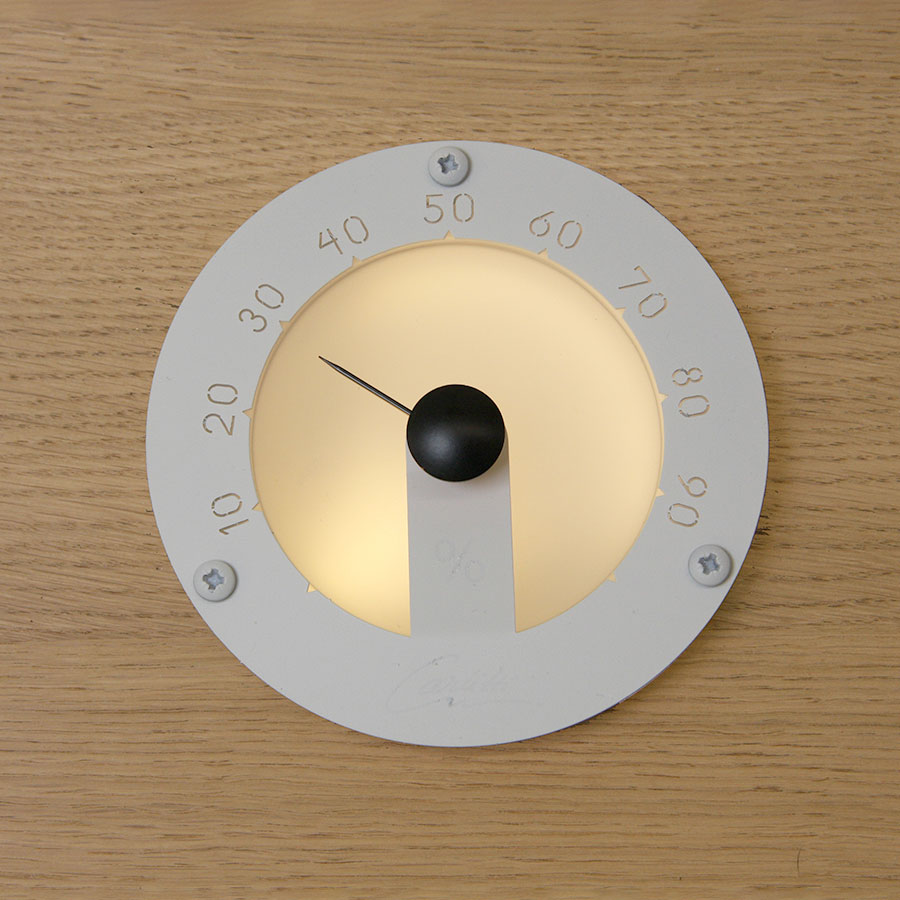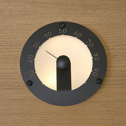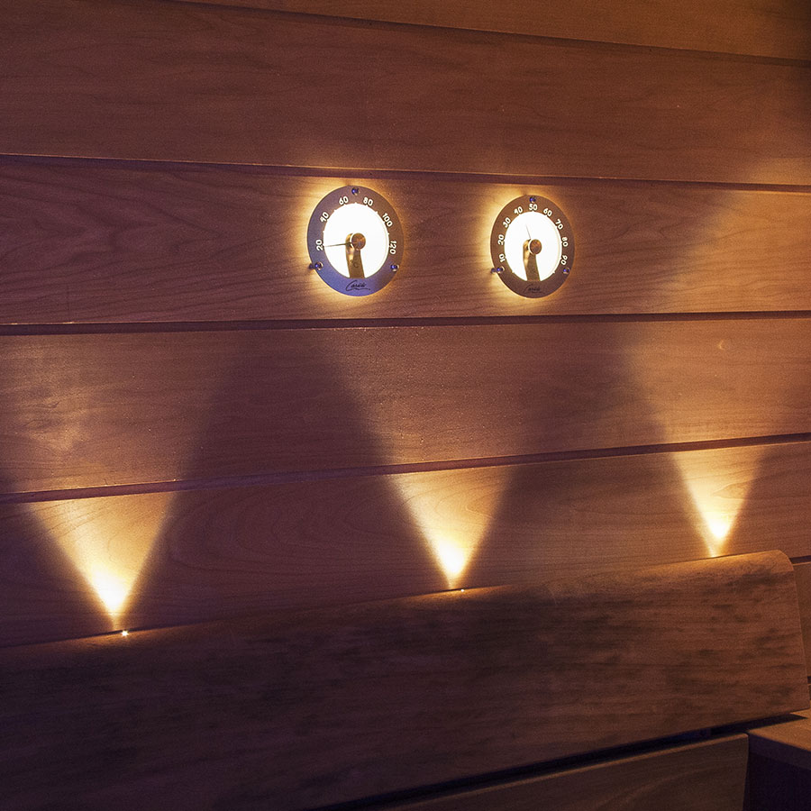 Светильник-гигрометр для сауны. Изготовлен из матового стекла и нержавеющей стали. Подсвечивается одним оптоволокном диаметром 2−4 мм или светодиодным кабелем. Устанавливается при обшивке сауны.