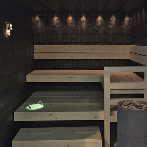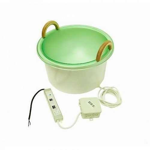 Уникальное сочетание резервуара для воды и светильника. Шайка изготовлена из матового зеленого акрила. Подойдет для бани и сауны. Доступна в исполнении с ручками, водосливным отверстием или клапаном.