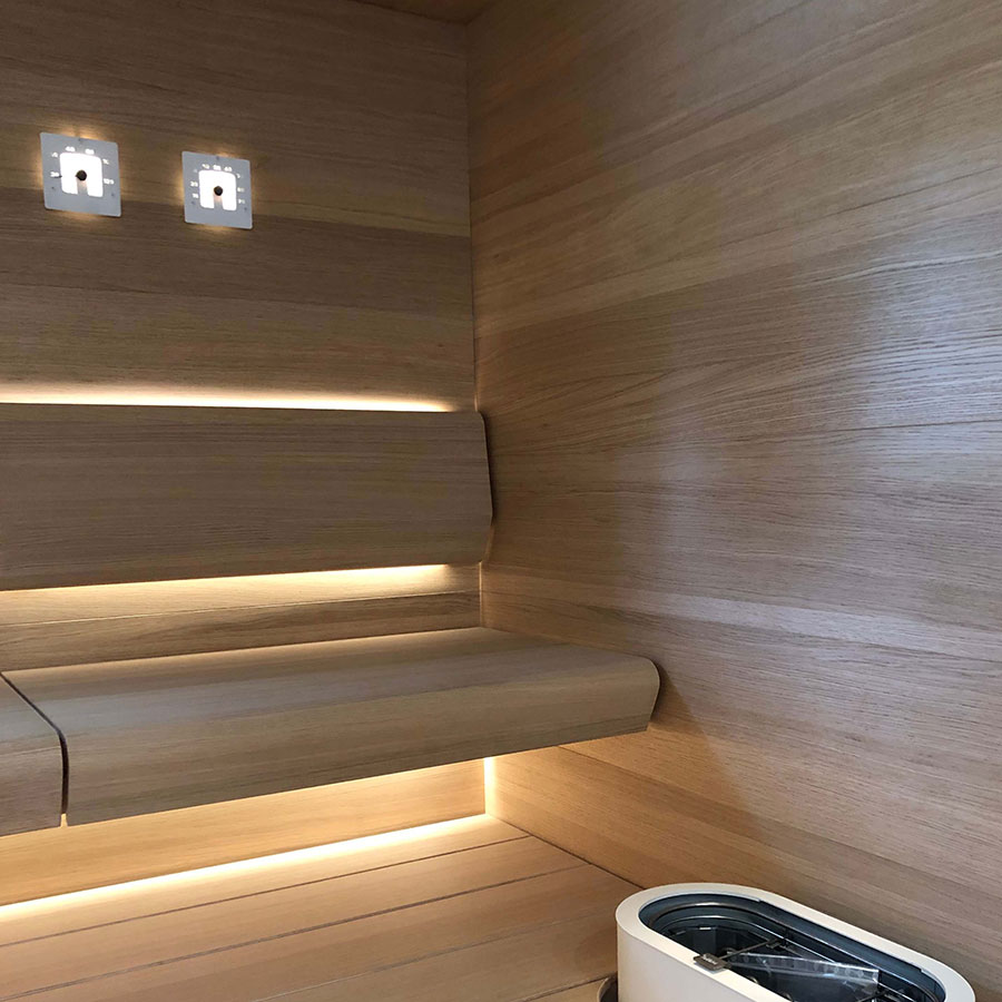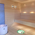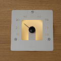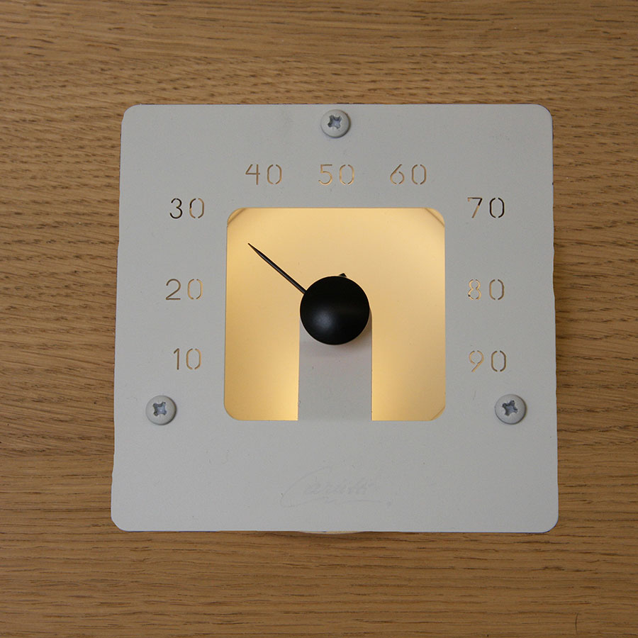 Светильник-гигрометр для сауны. Изготовлен из матового стекла и нержавеющей стали. Подсвечивается одним оптоволокном диаметром 2−4 мм или светодиодным кабелем. Устанавливается при обшивке сауны.