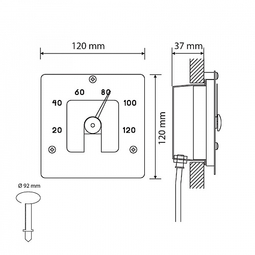 Глубина ниши для установки 40 мм. Выступает над поверхностью обшивки на 20 мм. Крепится к стене тремя винтами из нержавеющей стали, входящими в комплект.