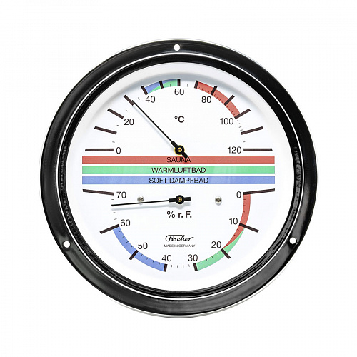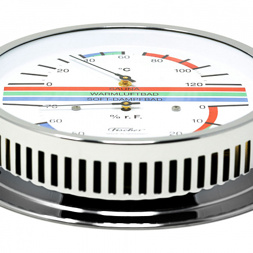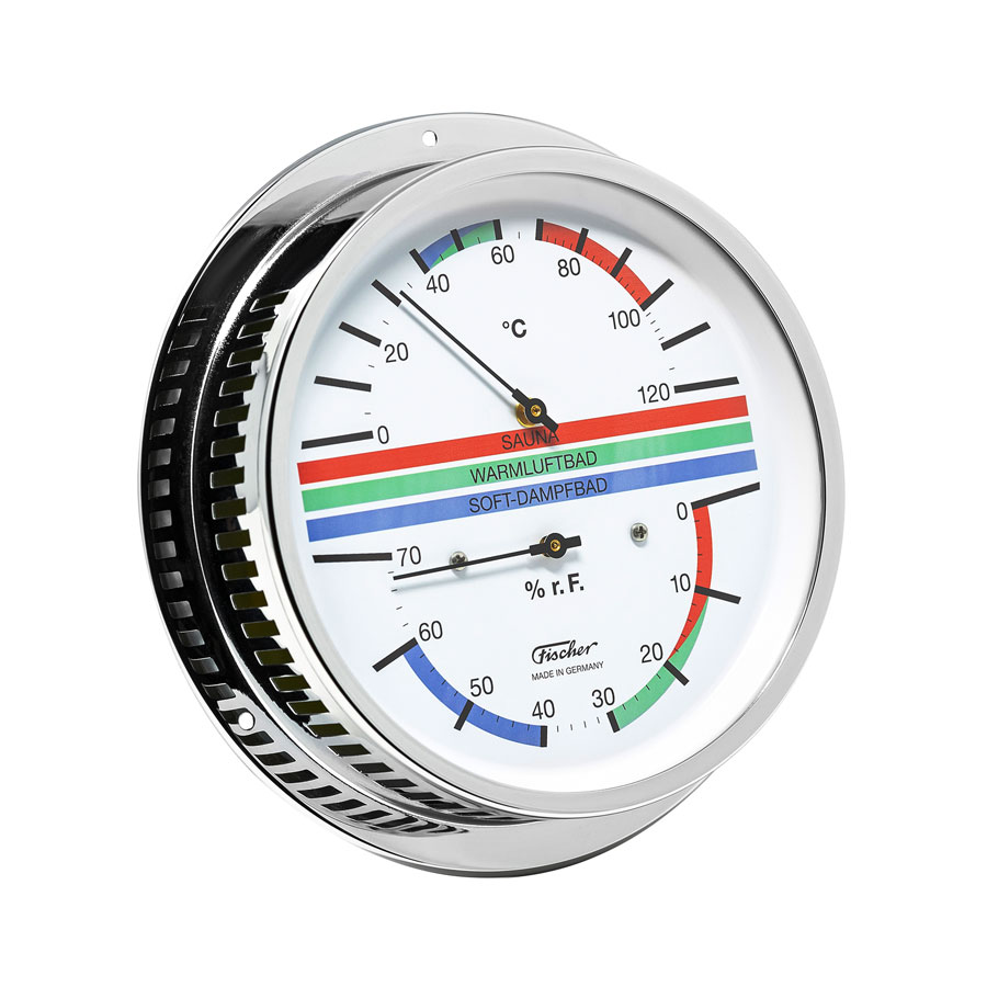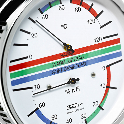 Немецкая компания Fischer создает измерительные приборы с 1945. Каждое устройство собирается вручную на заводе в Саксонии. Прибор предназначен для измерения температуры и влажности в сауне. Включает биметаллический термометр и гигрометр с синтетическим волосом. Корпус изготовлен из хромированной латуни. Точность измерения влажности ± 3% относительной влажности. Точность измерения температуры ± 1 °C.