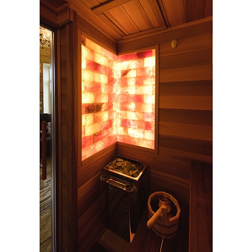 Неизолированные стены (например, кирпич, стеклянные блоки, стекло, бетон, керамическая плитка) увеличивают требуемую мощность нагревателя. Добавьте 1,2 куб. м к объему сауны на каждый неизолированный квадратный метр стены. Например, сауна объемом 10 куб. м со стеклянной дверью по мощности эквивалентна сауне объемом 12 куб.м.