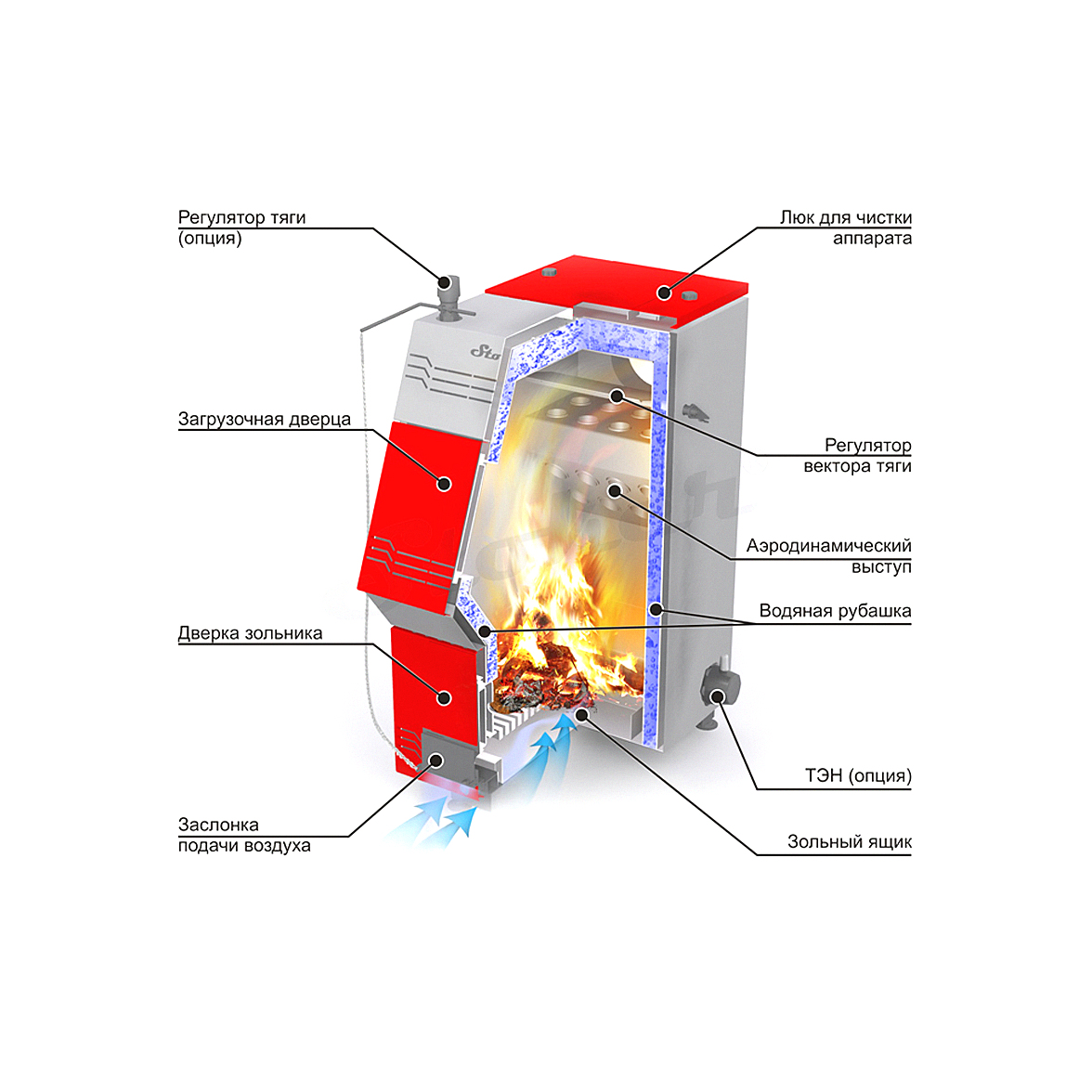 Отопительный котел Stoker Pro подходит для любых систем отопления, рабочее давление до 3 атм и применение дополнительных опций: регулятора тяги и ТЭН с ПУ, позволяет использовать его в системе с высоким уровнем автоматизации.