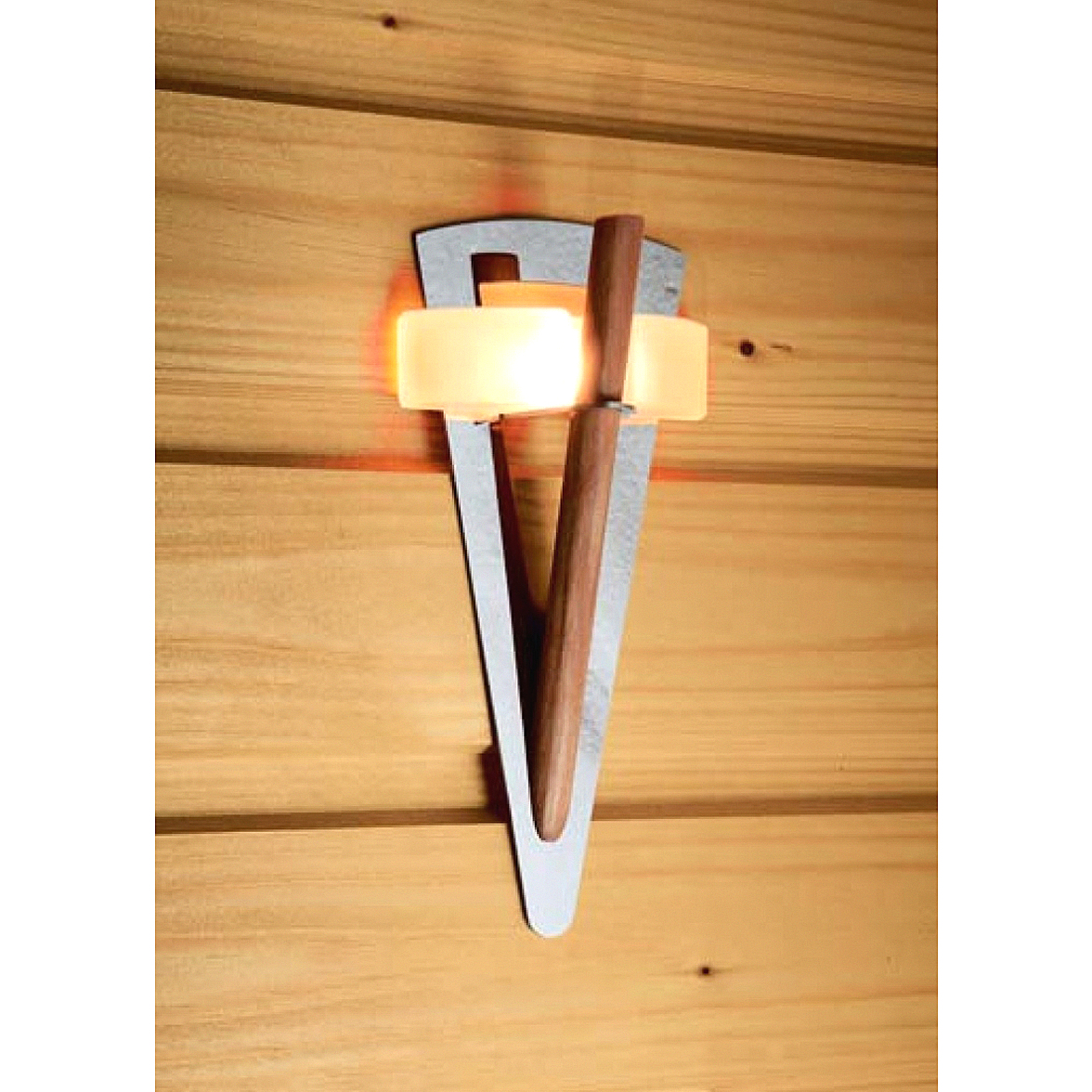 Светильник Факел настенного монтажа устанавливается на конце оптического волокна. Изготовлен из полированной нержавеющей стали, дерева и матового стекла.