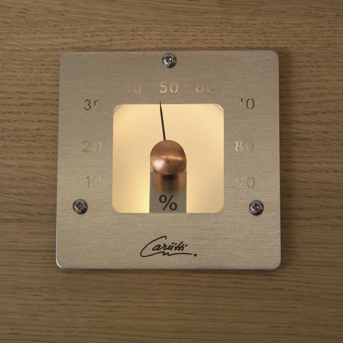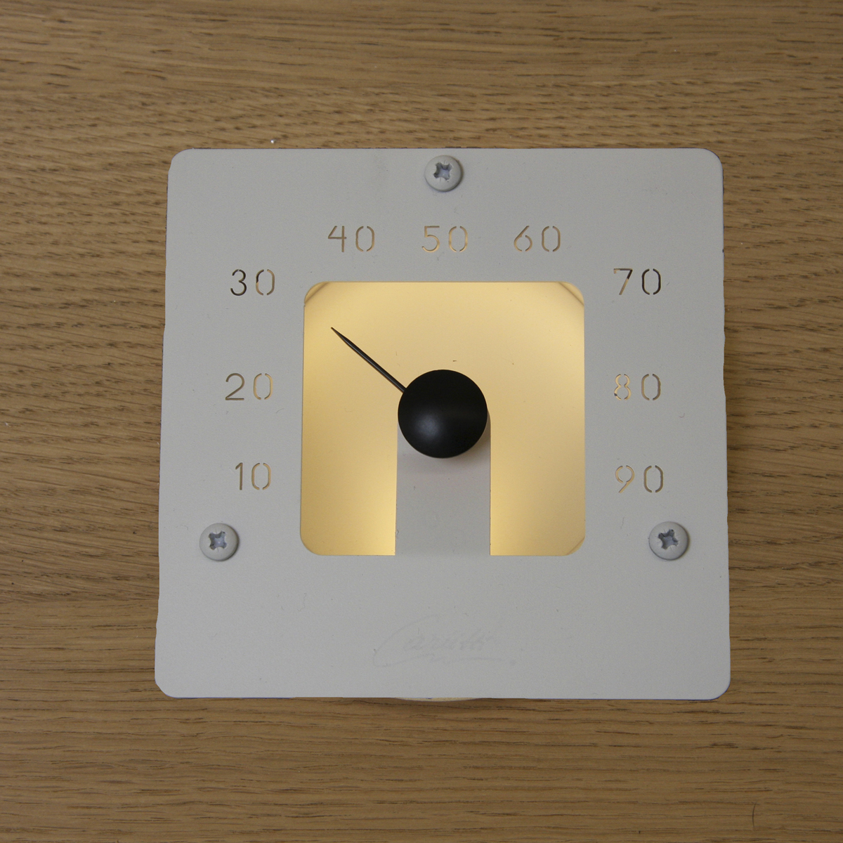Квадратный Гигрометр с матовым стеклом и тремя различными по цвету корпусами. Подсвечивается одним волокном диаметром 2−4 мм или светодиодом.