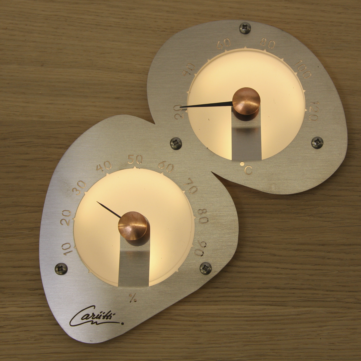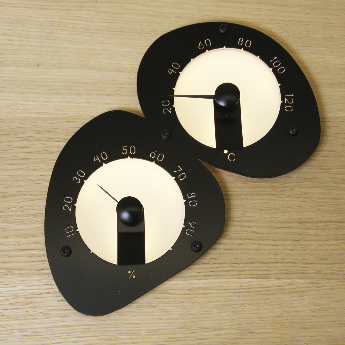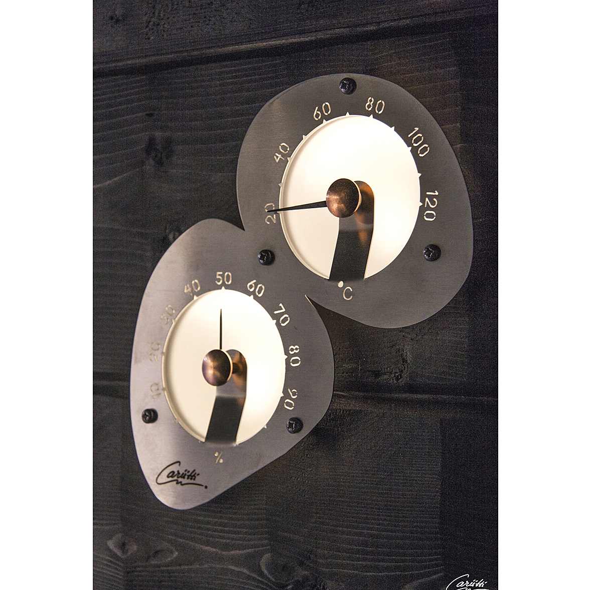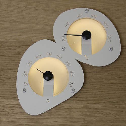 Термометр-гигрометр для сауны, форма которого напоминает камни на берегу моря. Высота термо-гигрометра 220 мм, ширина 205 мм и глубина ниши для установки 40 мм. Выступает над поверхностью обшивки на 20 мм. Крепится к стене пятью винтами, входящими в комплект.
