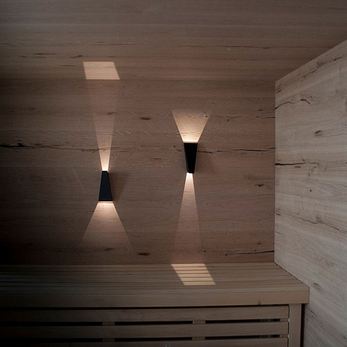 Настенный светильник для сауны. Напечатан на 3D-принтере из экологичного пластика, сырьем для которого является кукурузный крахмал. Направляет широкий луч в одну сторону и узкий в другую. При установке светильник можно повернуть в нужном направлении.