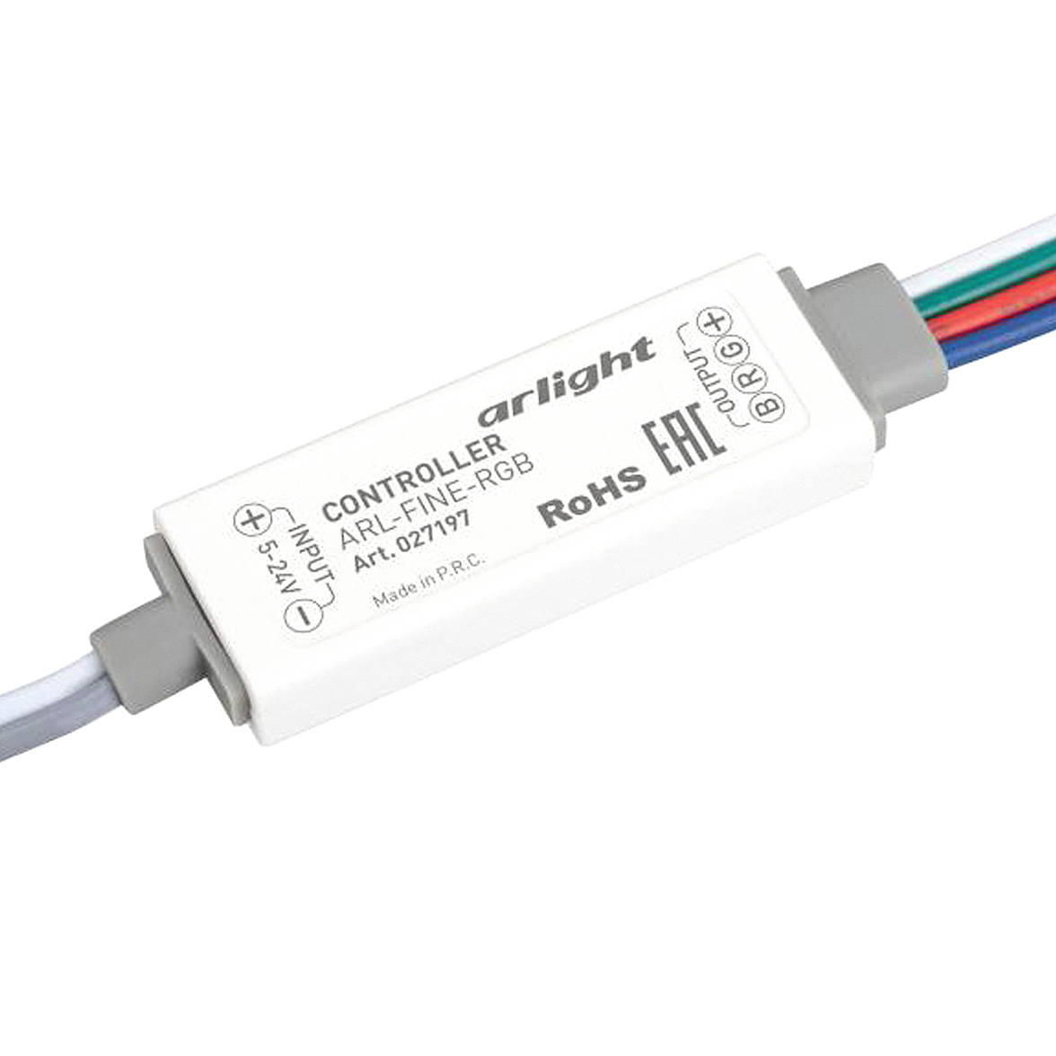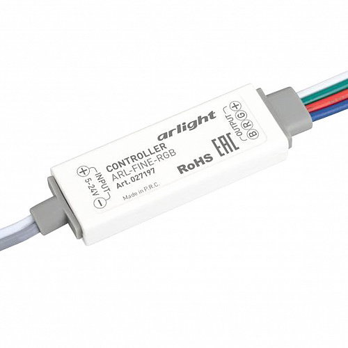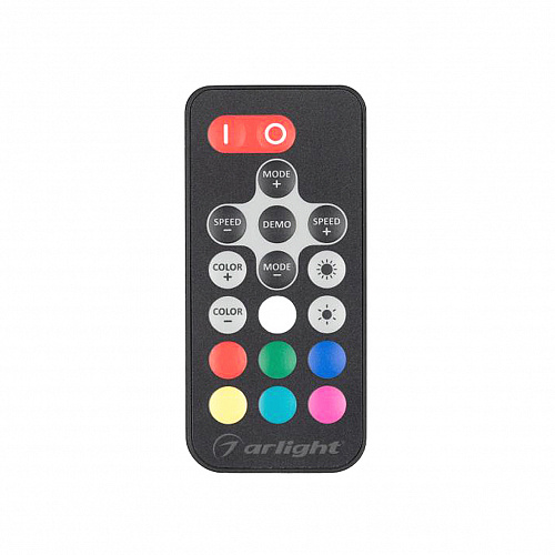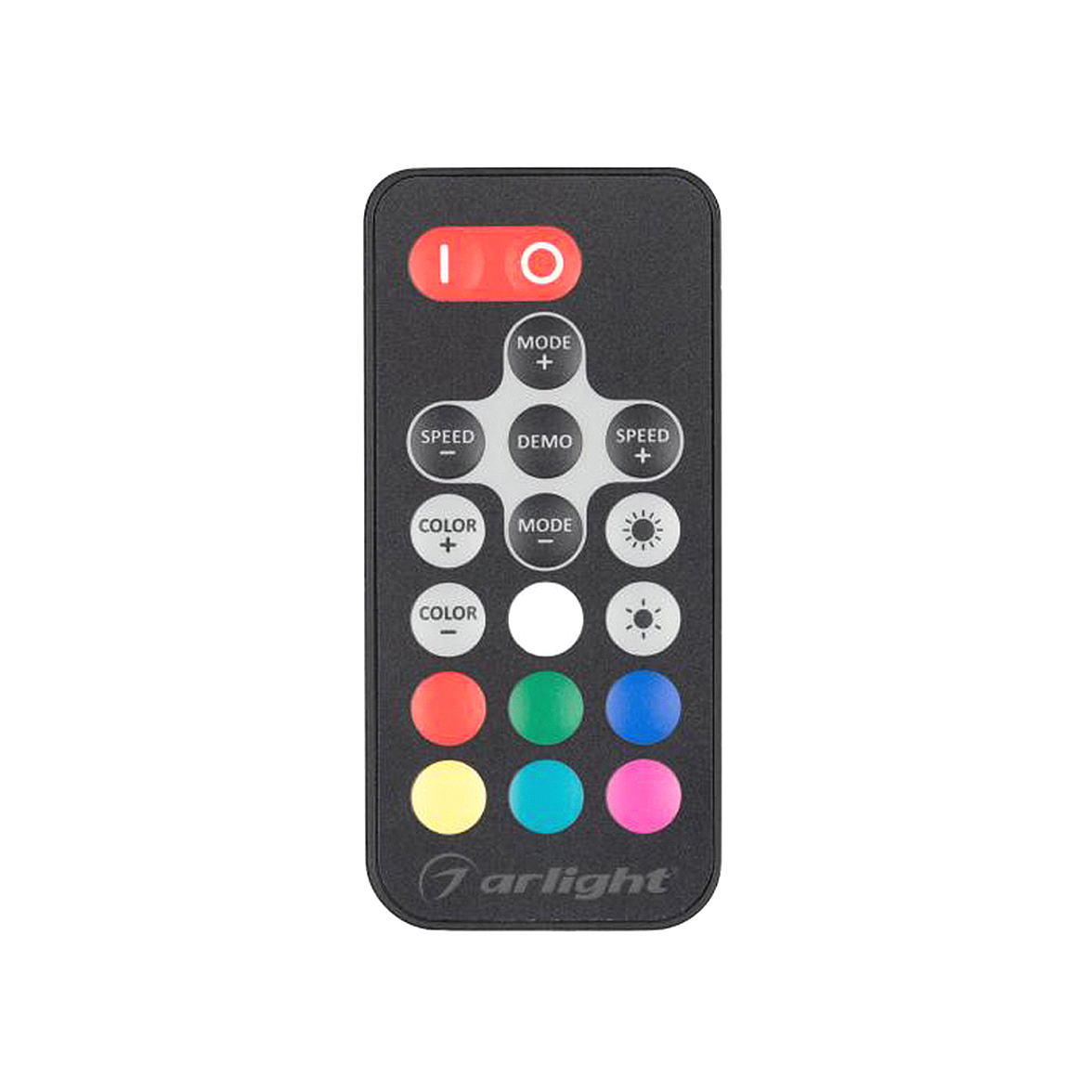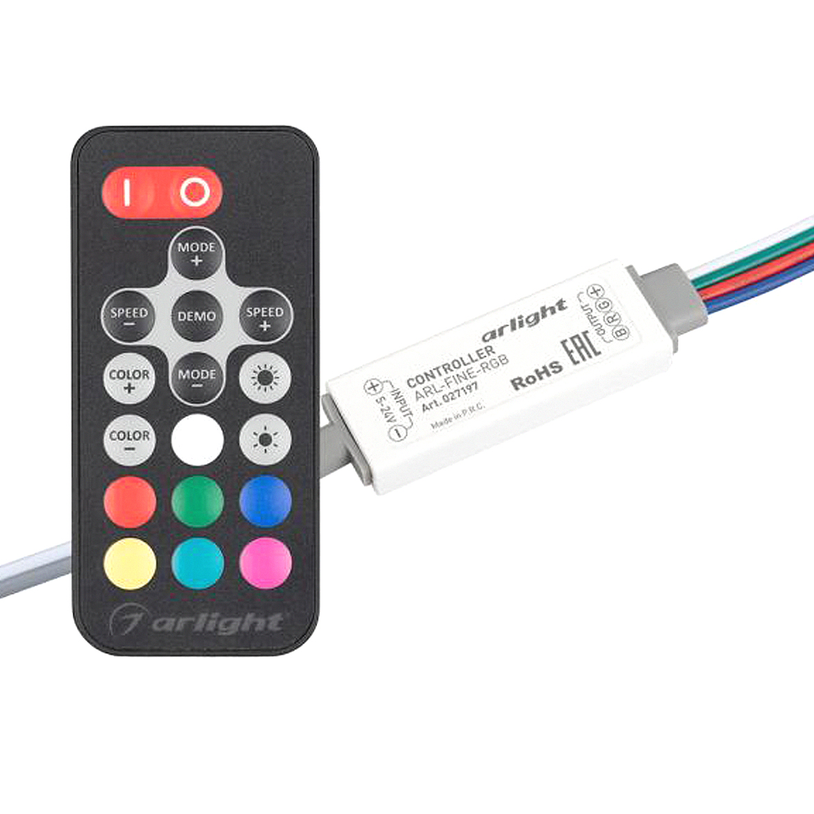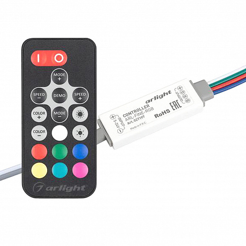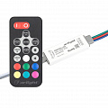Малогабаритный RGB-контроллер в термоусадочной оболочке с тонким радио-пультом черного цвета на 18 кнопок.