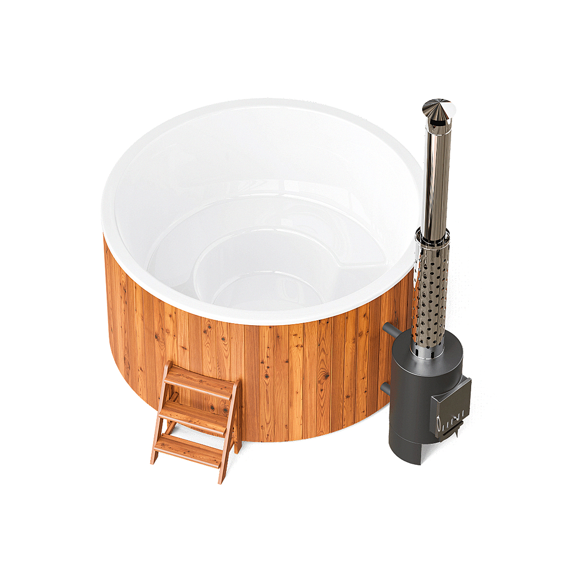 Модель оснащена внешней печью мощностью 40кВт, которая за 1,5−2 часа нагревает воду до комфортной температуры. Печь находится на безопасном расстоянии от купели — о нее невозможно обжечься.