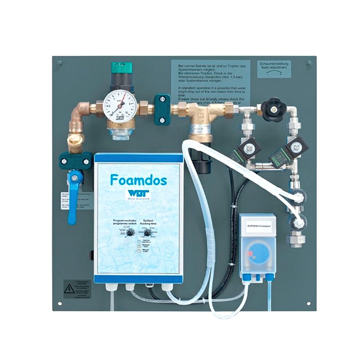 Невозможно представить турецкую баню без пенного массажа. WDT создали специальную машину, которая создает мягкую пену. На плате предварительно смонтировано оборудование, которое подключается к системе водоснабжения. Для начала работы необходимо залить мыльный раствор в специальный резервуар. Плата монтируется в техническом помещении, в самом хамаме выводится лейка, которая при нажатии на кнопку подает пену. Дозирующая станция FOAMDOS, используя 3 компонента, а именно воду, воздух и пенный концентрат, производит пену, которая наносится на тело посетителей при массаже в турецкой бане.