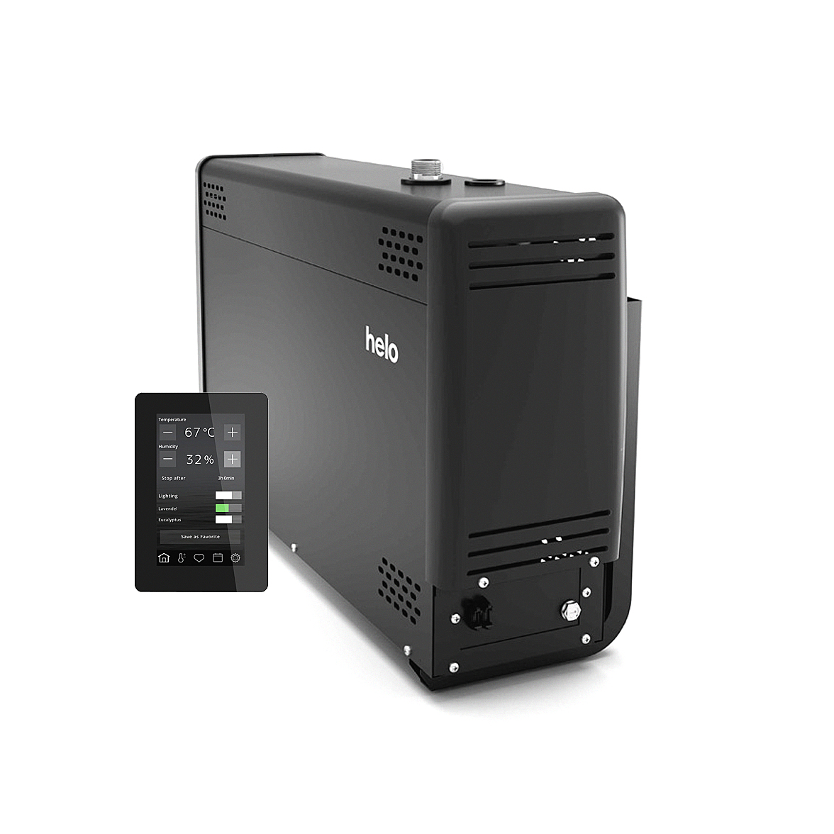 Парогенераторы Helo Steam Pro управляются с помощью цифровых пультов управления, входящих в комплект. Это обеспечивает новый уровень пользовательского интерфейса и надежности. Пульты позволяют удобно контролировать температуру, таймер, насос подачи аромаэссенций, вентиляцию и освещение.