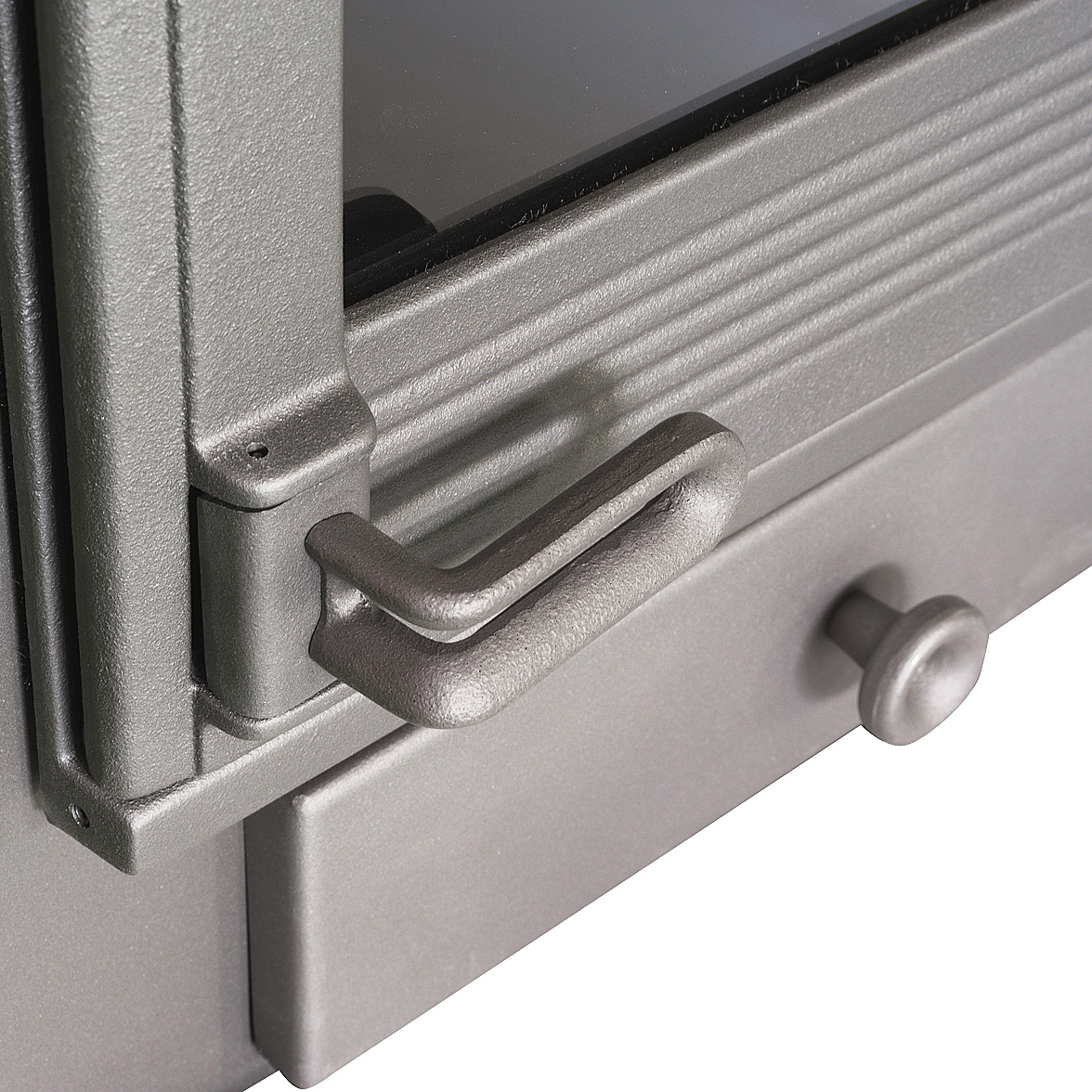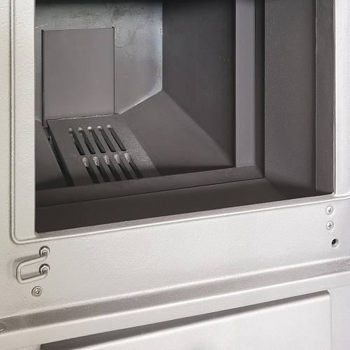 Печь топится из смежного помещения, в которое выходит топка с большим панорамным стеклом. Каминная дверь позволяет закидывать больше дров.