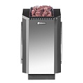 Перенавешиваемая дверка c панорамным стеклом оформлена в рамку из нержавеющей стали. Изделие выполнено в классическом стиле с преобладанием черного матового цвета, имеет хорошую эргономику и экономит место в парной.