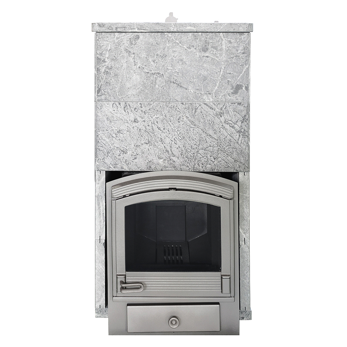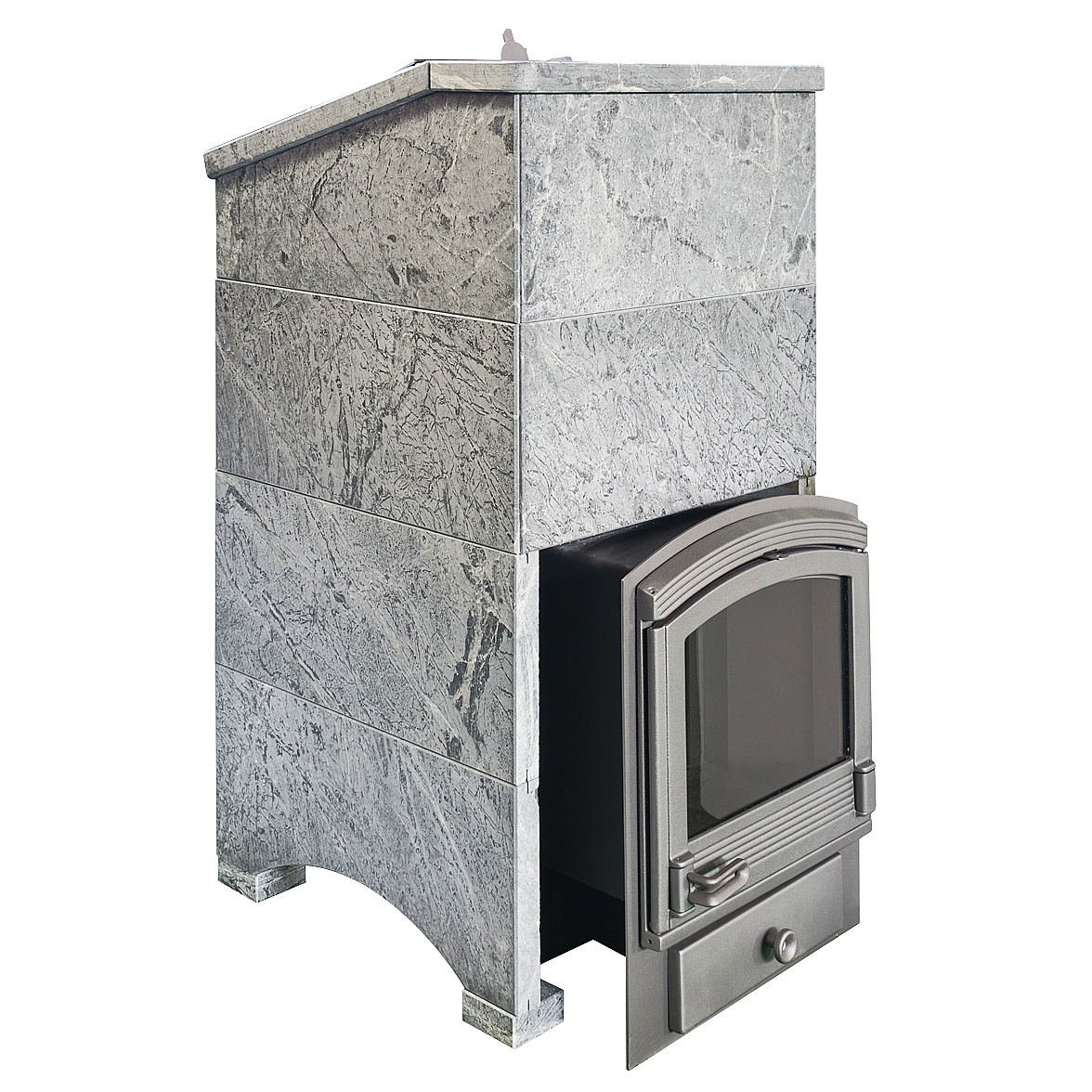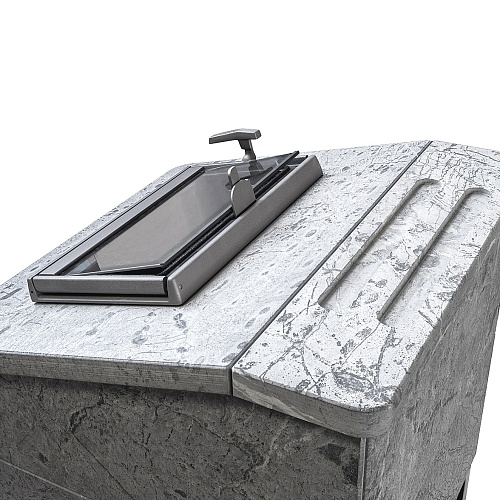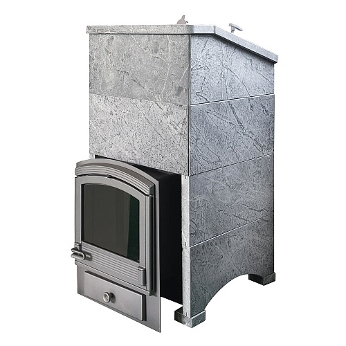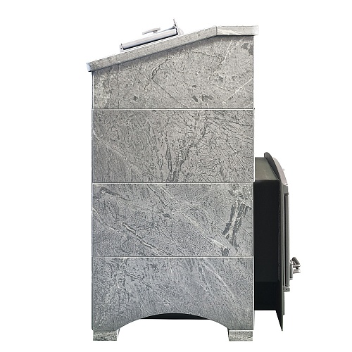 Облицовка собирается из плит толщиной 45 мм без клеевых растворов "на сухую" с помощью металлических закладных скоб. В отличие от кирпичной обвязки, облицовка из камня многоразовая и легко разбирается для замены печи или установки в другом месте.