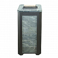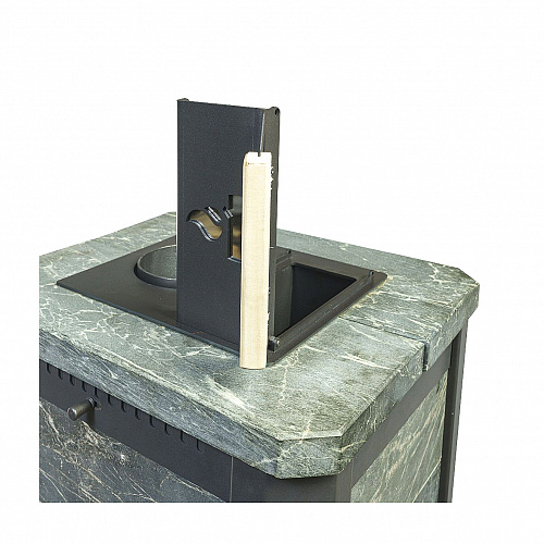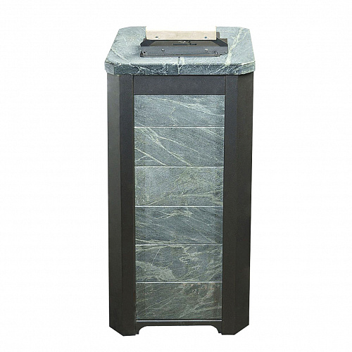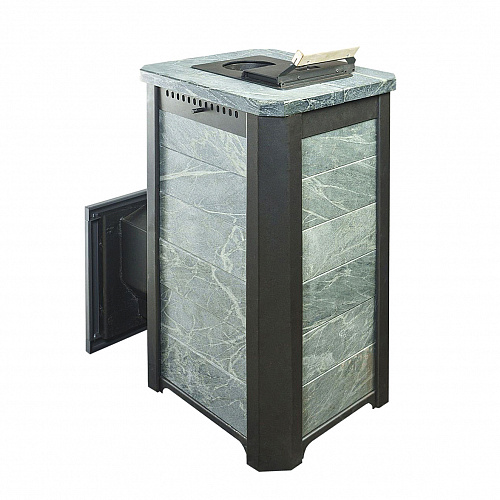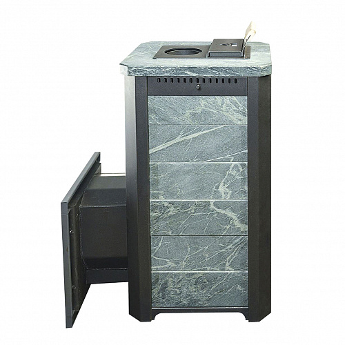 Обклад из природного теплоемкого камня талькохлорита или змеевика не позволяет сильно перегревать воздух в парной, а камни, закладываемые внутрь печи (около 70 кг), нагреваются сильнее чем в печах с открытой закладкой и на выходе получаем режим, приближенный к русской бане.